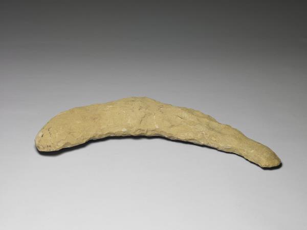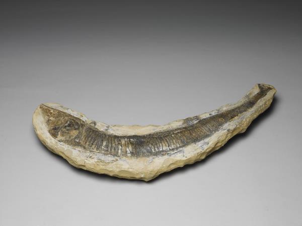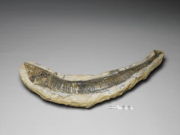 長形魚身化石一件,嵌於一灰白色石內。整體魚身修長微彎,魚口與尾皆朝上。魚身鱗片清晰可見。