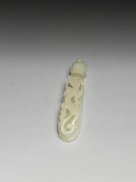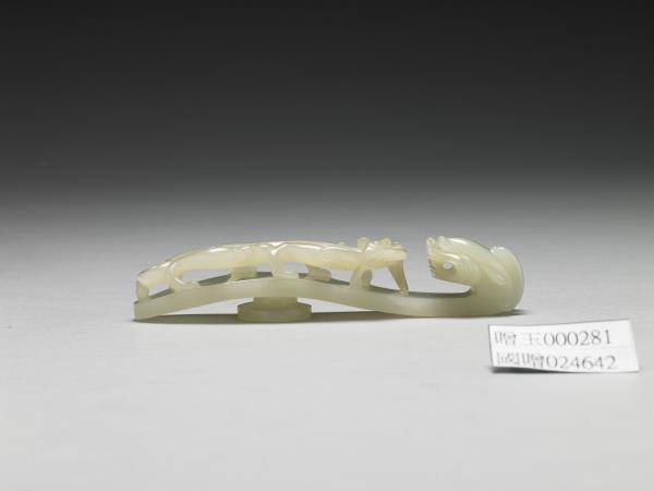 白玉,此器曲鉤部份做龍首,鉤面立雕一蟠螭,背面有一圓柱。
