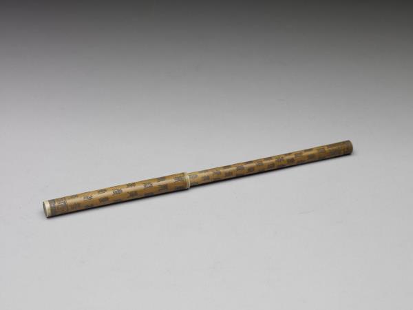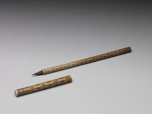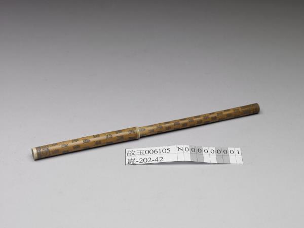 竹製筆管帶筆套,筆套上下端各嵌一象牙環。筆套前端及筆管尾端刻有回紋,器身滿刻各式字體之「壽」字。為故玉6105〈玉山水樓閣筆筒〉附件。