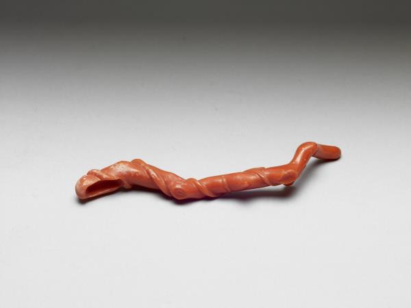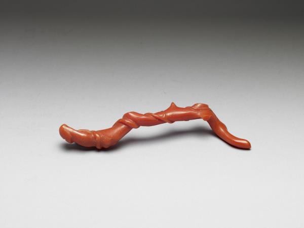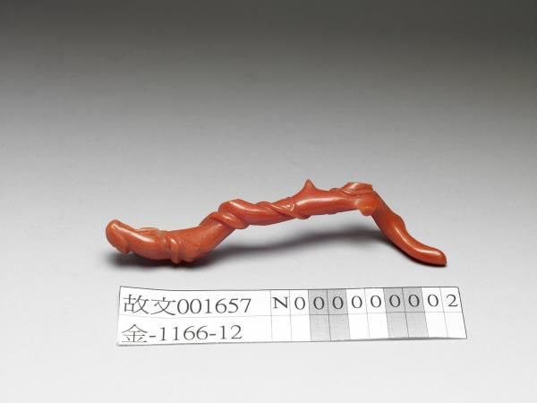 珊瑚質,紅色,色稍深,條狀,略有不規則起伏與瘤結,與樹枝形象接近。較粗一端雕為勺狀,其餘部分則保留珊瑚枝的原本不規則彎曲樣貌,並在扭轉與瘤結處雕細籐纏繞,使整器纏繞扭轉的視覺感更為加強。