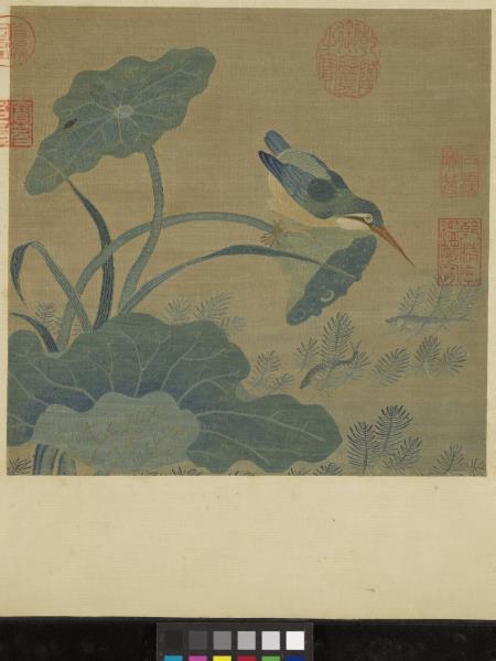 淺褐色地設色織。秋荷蓮蓬上立一翠鳥,神情極其專注俯視水中游魚。此幅設色精雅,織工技藝高超,觀察入微。運絲如運筆,利用色線表現水之深淺,魚草之游動,荷葉瓢蟲,均栩栩如生,極得寫實畫意,為宋緙絲冊頁中無上佳作。