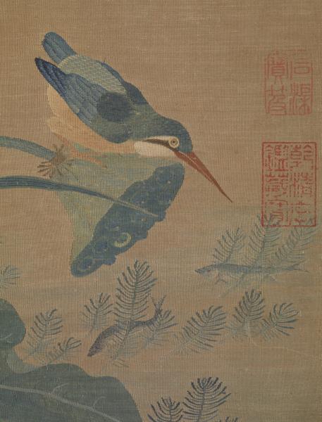 宋代緙絲,設色典雅,技術精巧,是緙絲的黃金時代。此幅刻織秋天池塘一景,蓮蓬上立一翠鳥,神情專注地俯視水中游魚,而小魚卻不知大難臨頭,仍悠游於水草間,微風輕吹著蓮葉,富戲劇張力。此幅設色精雅,織工技藝高超,觀察入微。利用色線表現水的深淺、魚草之游動,荷葉瓢蟲,均栩栩如生,極得寫實畫意。為宋緙絲精彩之作。