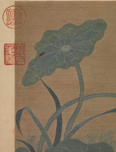 此幅設色精雅寫實,雖以藍綠色系為主,但分色細膩,尤其在荷葉、葉脈、水草深淺色系的處理十分獨到。所用緯線似為麻或是柞蠶絲,因此光澤度較差,進而使織品的質地呈現較粗糙且具重量的質感,極得宋代寫生小品畫意。