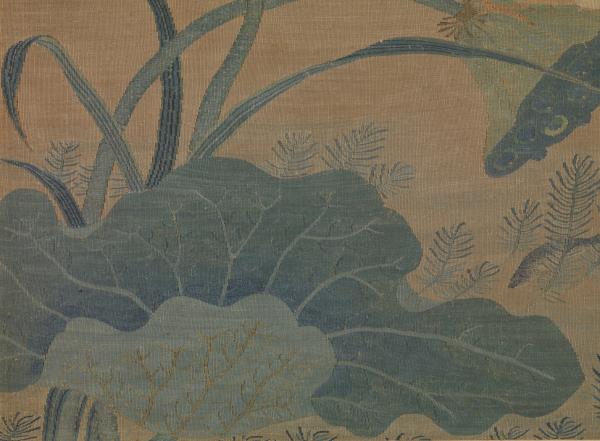 The colors here are elegant and realistic. Although the main hues are blue and green, their separation is very refined. The treatment of light and dark colors in the lotus leaves, stems, and water plants are also exceptionally original. The weft threads here appear to be hemp or tussah silk, thus accounting for the relatively lackluster appearance, while the material in the weaving is coarser and heavier. The weaving, however, is compact and detailed for a serene scene from life much in the painterly manner of intimate “sketching-from-life” works of the Sung dynasty.