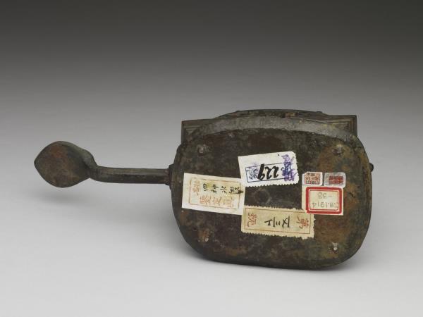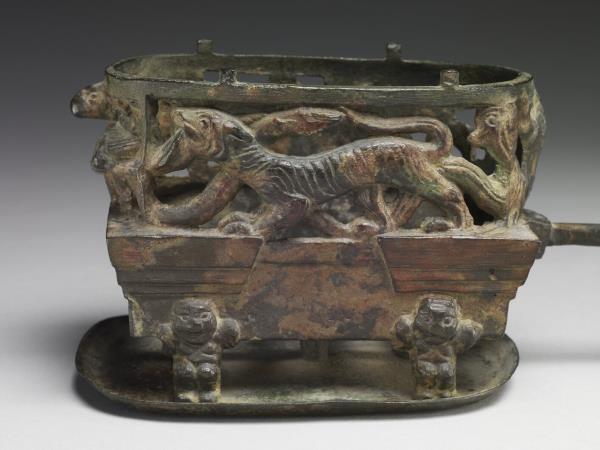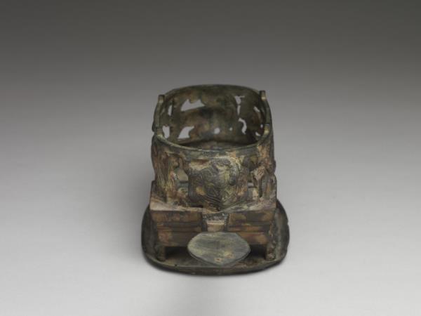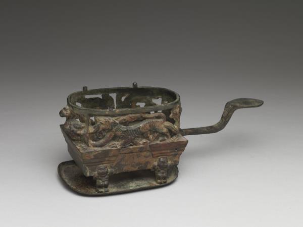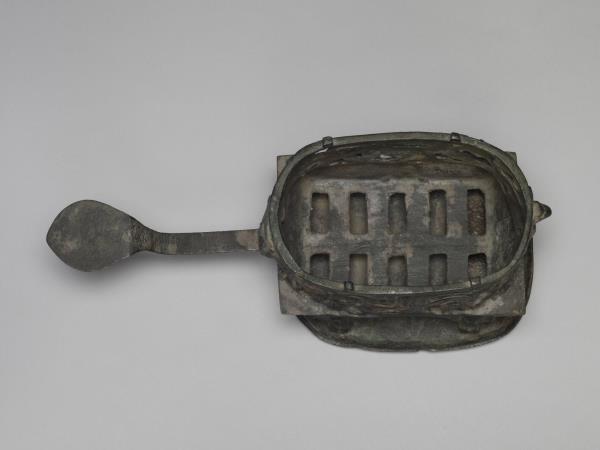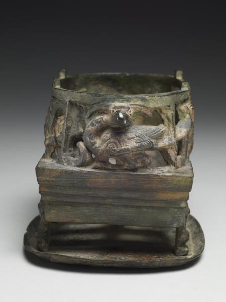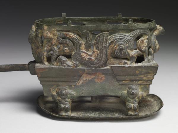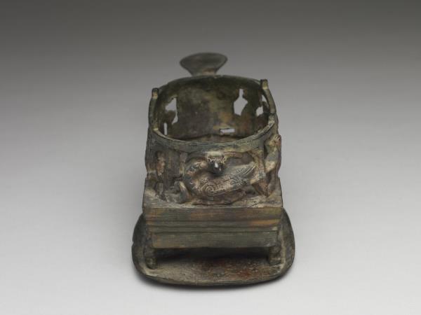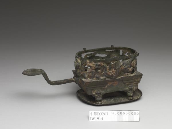 | 說明 | 直口,方底,四人形足,下接圓角長方形承盤。橢圓形爐身,四邊分別飾有鏤空四神:青龍、玄武、白虎、朱雀,青龍與白虎相對,位於長邊,玄武及朱雀位於短邊;下方為中空方座,座下有四人形足,皆作半蹲狀,雙手彎曲上舉,將爐扛負起來,下接承盤,盤底四角各有一乳丁足。爐內有一八孔隔板,可放置燃燒的木炭或香木,燃燒後的灰燼可透過方孔落下至中空方座中。漢代人食肉時,常用銅爐上置耳杯盛醬料加熱,再將肉放入醬中烹煎。其醬汁叫「染」,所用器具即稱「染器」。 |