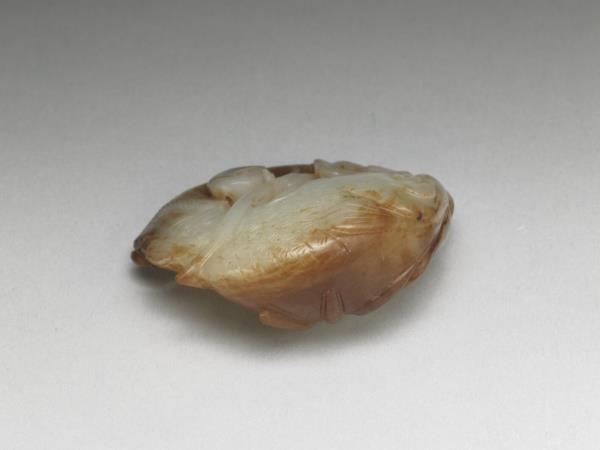 玉質,邊緣有大片褐斑,琢一優游水藻間的鱖魚。魚身豐腴,腹部尤其飽滿,然因尾部上揚,線條又極為自然流暢,賦予了強烈的躍動感。陪襯的水藻採多層次鏤空技法,更增作品生動活絡的趣味。