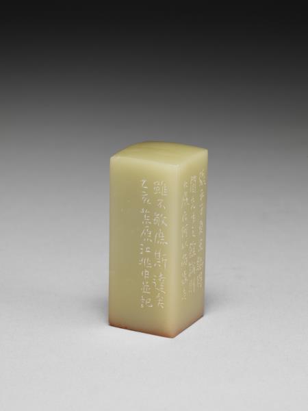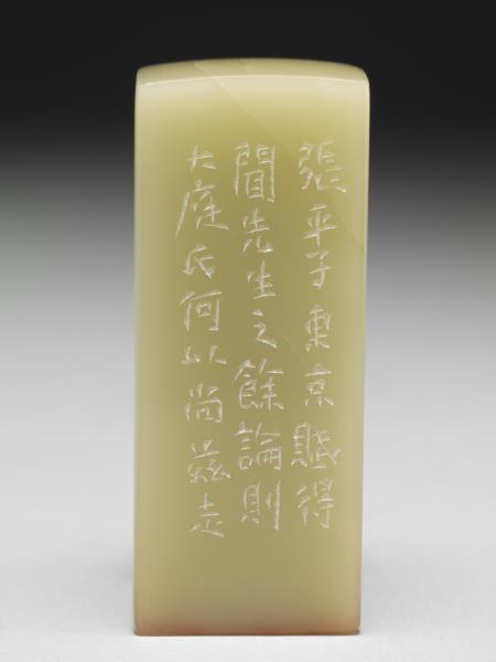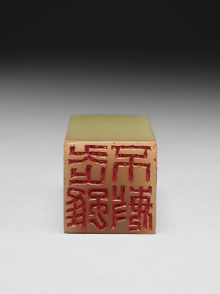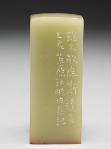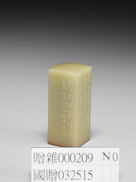 | 說明 | 長方柱形青田石印,有石璺,色青,印頂弧起,外壁光素無紋。印面正方,江兆申刻白文:「走雖不敏」雙行四篆字,邊款刻:「張平子東京賦。得聞先生之餘論,則大庭氏何以尚玆。走雖不敏,庶斯達矣。乙亥椒原江兆申並記。」款識共佔外壁兩面。乙亥為民國八十四年(1995)。由邊款可知印文內容來自於張衡〈東京賦〉,所謂「走雖不敏」,固是謙抑的自稱,但也有自詡能當此局面的意味,實是江兆申寓自信於謙虛的作品。值得注意的是,江兆申曾入溥儒門下學習詩文,《昭明文選》乃是溥儒囑咐江兆申閱讀的文獻,而本印印文「走雖不敏」所源出的張衡〈東京賦〉一文,又收錄於《昭明文選》中,或許這正顯示了江兆身為學的重要根源之一。 |