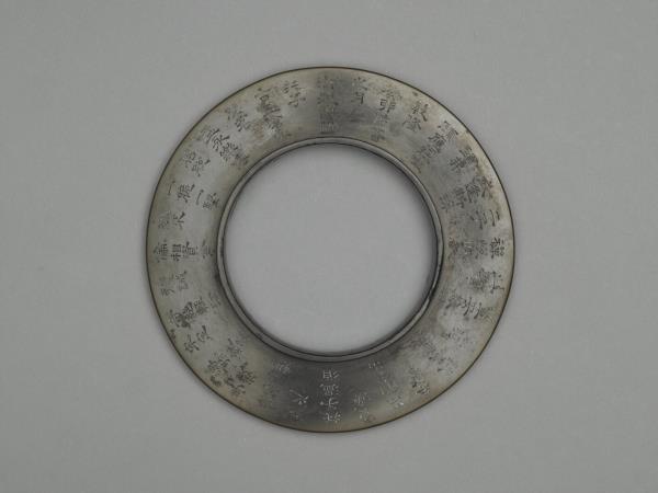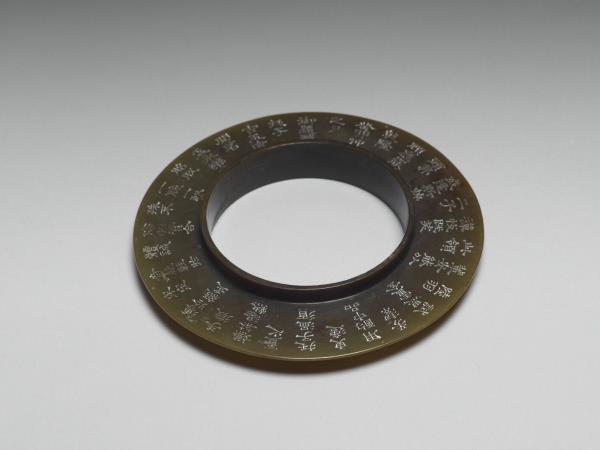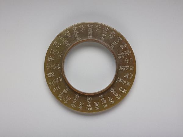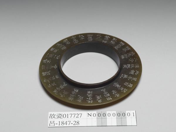 | 說明 | 凸緣璧,色深黃褐,面光素。壁面刻清高宗作於乾隆五十(1785)年的詩作〈詠玉托子、永樂脫胎茗盂〉,該詩收於收於《御製五集》卷十三。由詩的內容可知,該器與同刻有此詩的院藏白瓷盞(故瓷17727)成組。本器內圈凸棱,正可容為白瓷盞之托座。 |