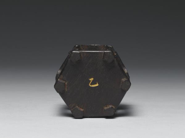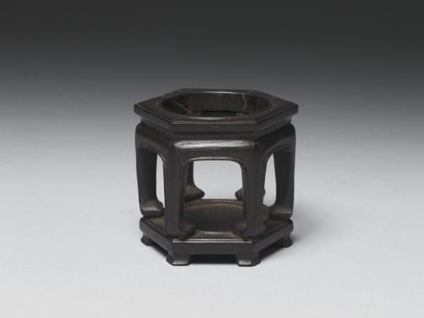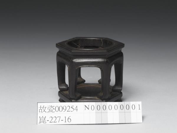 木座,整器猶如一六角凳面的凳子置於六角形座上,凳面鏤圓穿,恰可使長筒狀的器物置於其中,兼具穩固器物和保護器物的功能。院藏的青花番蓮紋瓷筆筒(故瓷9254)即置於其中。座底外中心有填金楷書「乙」字,當為清乾隆時所加,代表清高宗對座上器物的評等。