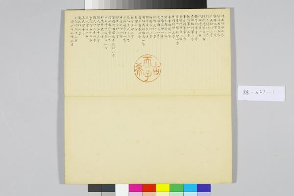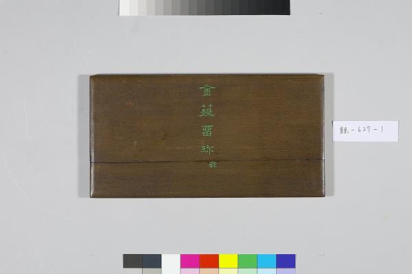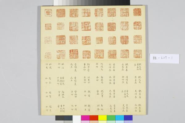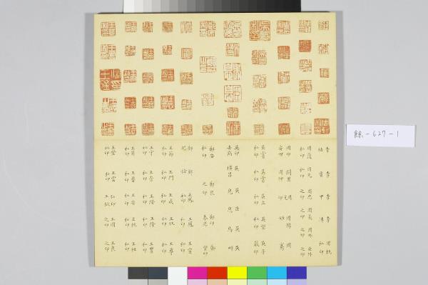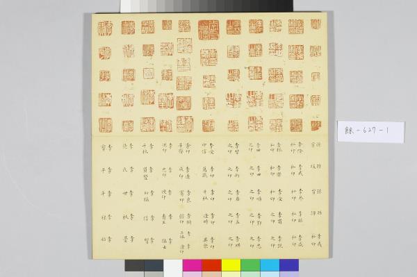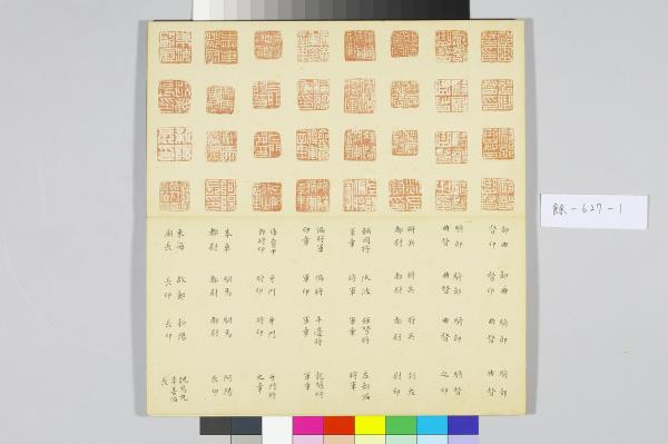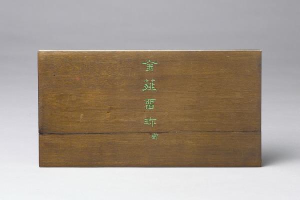 院藏有五件樣式類同的黑地金漆龍紋屜匣,內皆置木殼面小冊頁一本,以及為數眾多的銅章。由於屜匣的蓋面都有金漆「金薤留珍」楷字,且其題銘後各自附有一小字,分別為「東」、「壁」、「圖」、「書」、「府」,可知這是五組成套的印章收藏。其中的木殼面小冊頁,即為該屜匣所收銅章的目錄,而本件小冊頁即為置於「壁」屜匣者。小冊頁作梵夾式,七開,木質封面有「金薤留珍 壁」填綠隸款。內頁除清高宗行書題銘「金薤留珍」四字外,還書有為該屜匣所收銅章品目項類,以及銅章鈐跡、印文釋文,其鈐跡與釋文上下相對,使人一望可知該屜匣所收銅印的概況,「壁」字匣主要收藏官印與私印,計二百二十三方。若是進一步取閱「東」字號小冊頁的乾隆十六年(1751)清高宗所作〈古銅章歌〉,以及「府」字號小冊頁中的大臣跋語並讀,便可瞭解這一套收藏的緣起,實因於乾隆皇帝命令臣下整理編次內府所收的前代印章。古代銅玉印之為收藏的品項,大致可追溯至宋代的《宣和印譜》,但因無實物可徵,故真實性仍有待商榷。至明代,顧從德為羅王常(製墨家羅小華之子)家藏古印刊行的《集古印譜》問世以後,才真正讓古代印記成為收藏的重要品項。影響所及,除了篆刻家多以《集古印譜》所刊為臨模範式外,人們也會想要收藏《集古印譜》中所刊的印章實物,院藏乾隆皇帝下旨編次的〈虹文薈古〉套印,就是這種影響下的產物。進一步細察「金薤留珍」諸字號小冊頁中目錄編次,其以官印為始,私印為次,並從中分別官職、姓氏,實是上追了《集古印譜》編次分類的方式。如此一來,我們更可以瞭解這一套收藏活動的性質,不只是整理內府收藏,而且還援引了明代以來的銅玉古印收藏傳統。