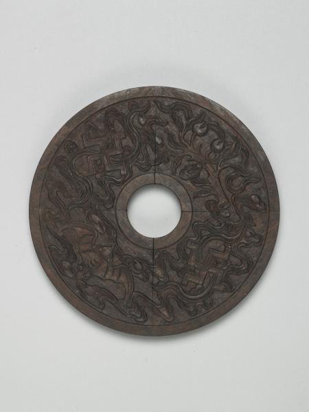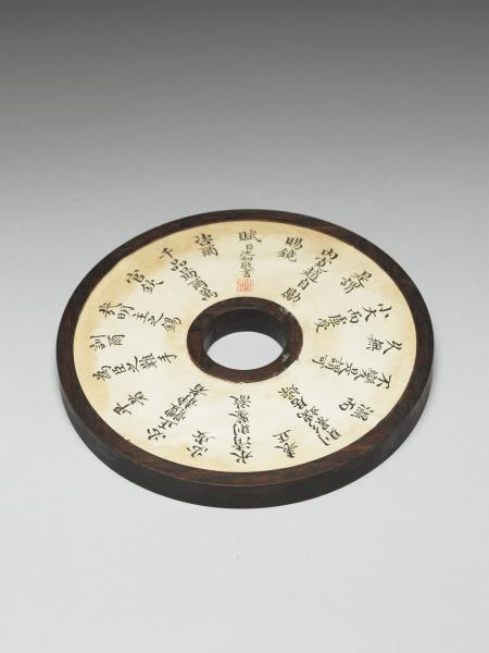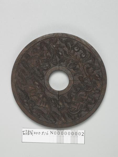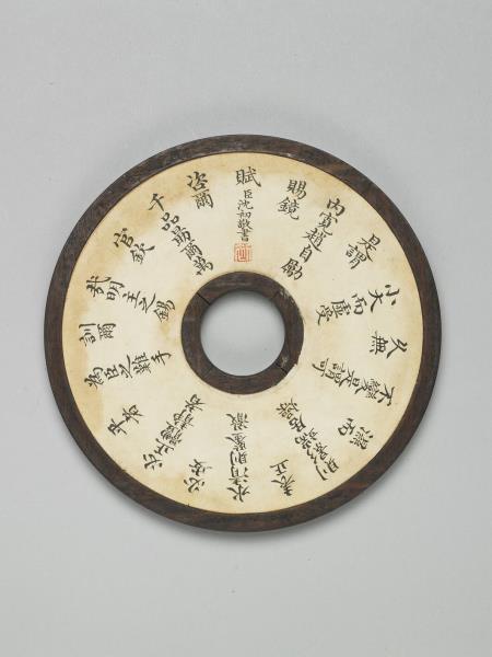 | 說明 | 玉璧形木片,中有穿,兩面邊廓皆起棱。一面淺浮雕流雲地,流雲上漂浮著「卍」字、蝙蝠,以及結實纍纍的桃枝,象徵著「長壽」、「福」等吉祥意涵;另一面裱紙,紙上為沈初楷書書作,內容為抄寫趙自勵之〈賜鏡賦〉。由於清代乾隆皇帝對於珍視的古物,常常會用一些特別的製作來加以裝盛、收藏。對於收藏銅鏡,他就在「冊頁」形木方匣內依照銅鏡形狀挖槽收藏,收藏時鏡上先置軟墊,再覆以雕飾精美的木質蓋。而前述的玉璧形木片,即是木質蓋。 |