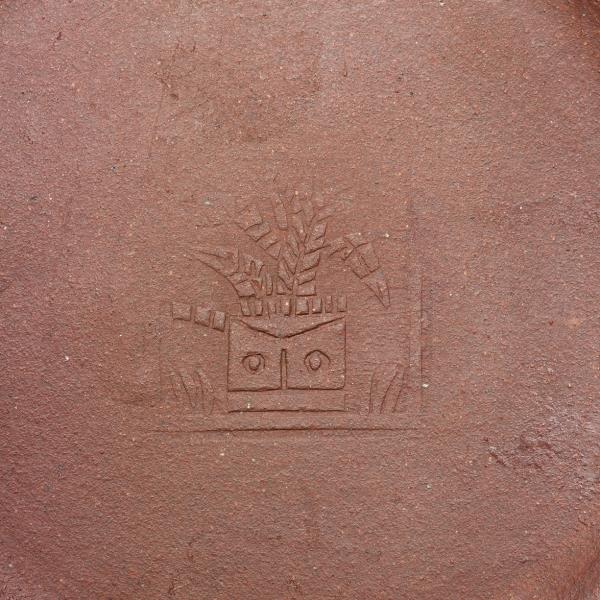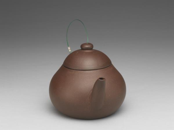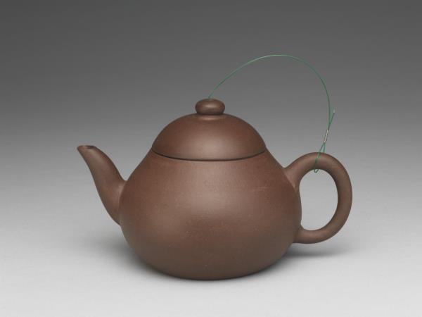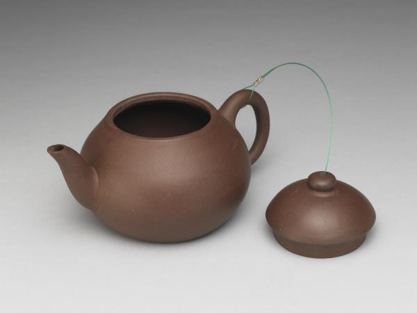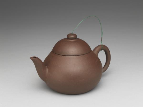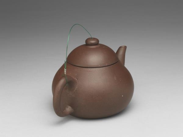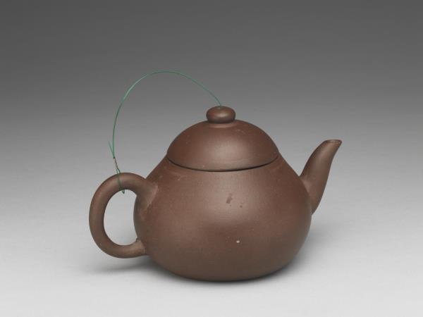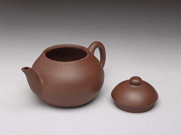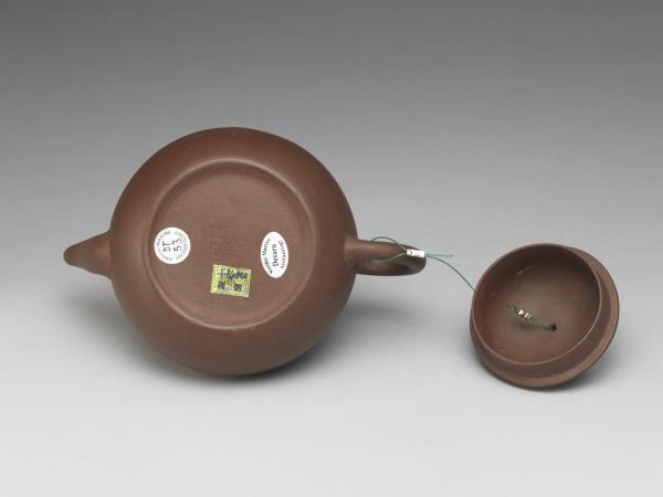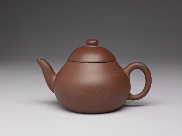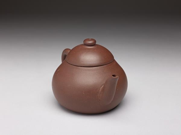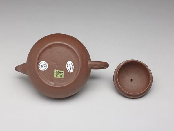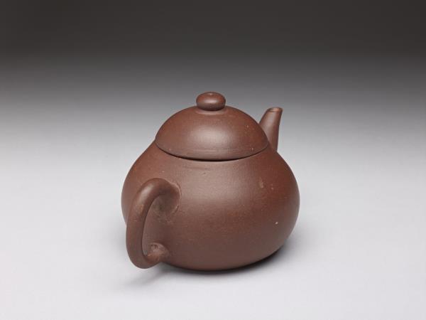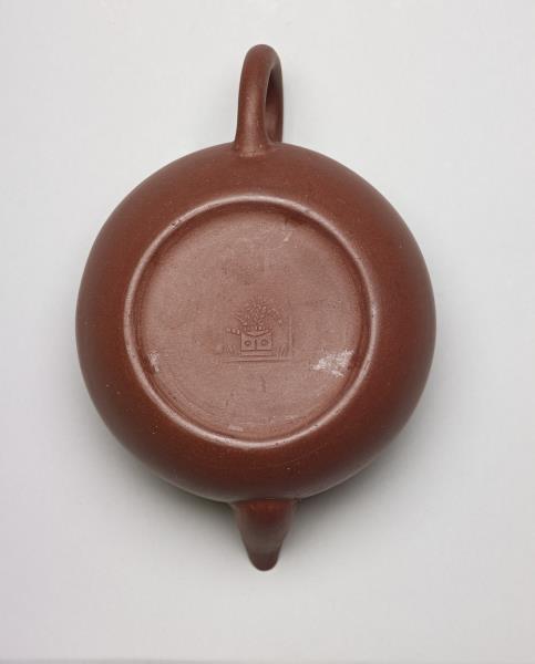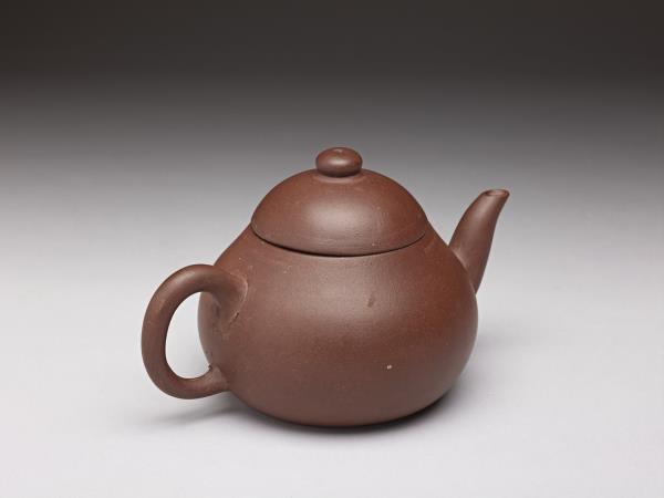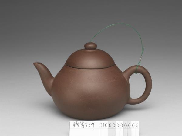 | 說明 | 紫砂泥胎,梨形壺,圓蓋鈕,斜直流,弓形把,鈕頂設通氣孔,平底凹足。紫砂泥質較細,帶黑、黃砂點,器底印飾方形與類似蕉葉圖案的花押款。全器胎體略厚,作工粗糙,流、把接連處並未仔細修飾。據捐贈者告知,此壺來自迪沙如(Desaru)號沈船出水,這艘載有近千件宜興茶壺的木製商船,為十九世紀四十年代道光年間航行於中國與南洋間,承載陶瓷貨物外銷東南亞,1845年左右沉沒於馬來西亞。載貨多為一般生活用品,有逾五萬件以上的青花碗、盤、碟、湯匙,以及來自景德鎮、德化窯的陶瓷缸甕等。宜興壺則多具江南紫砂壺及閩粵工夫茶器特徵,典型的梨形壺及直嘴扁腹壺最多,而另艘泰興號沈船亦有相同造型茶壺出水。 |