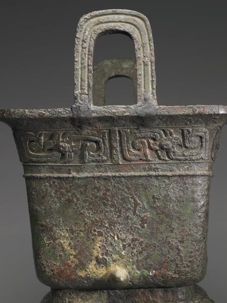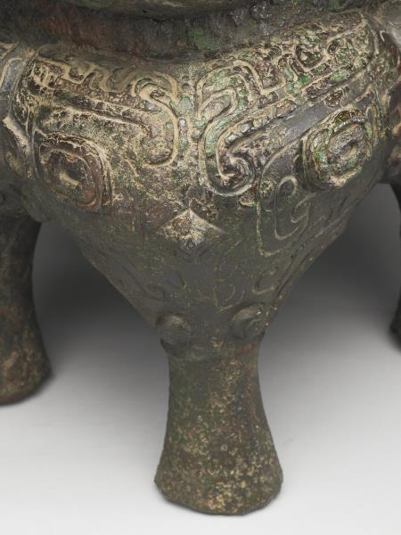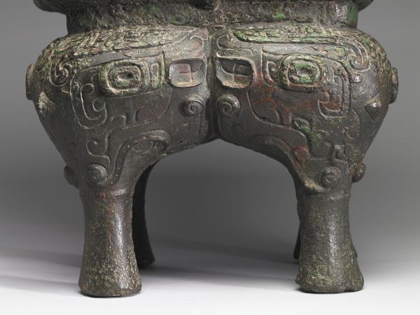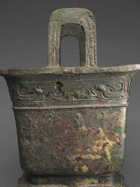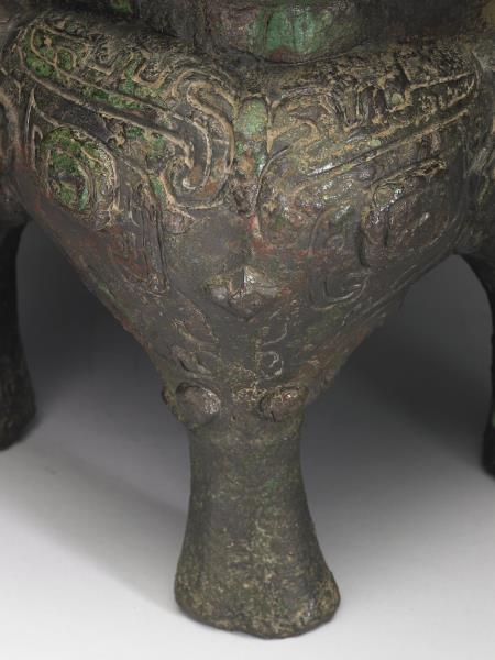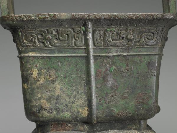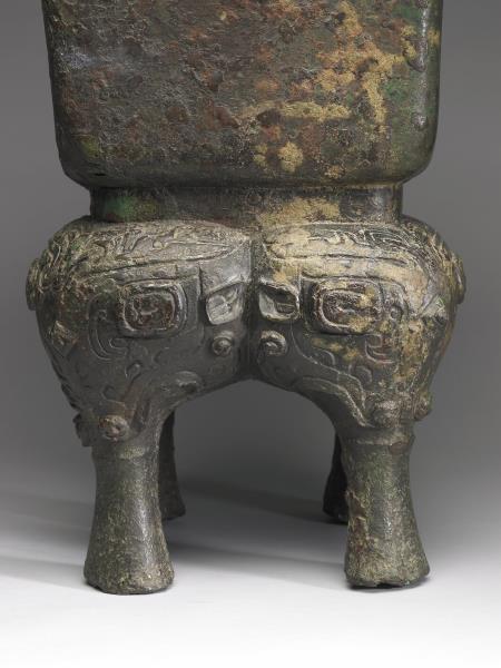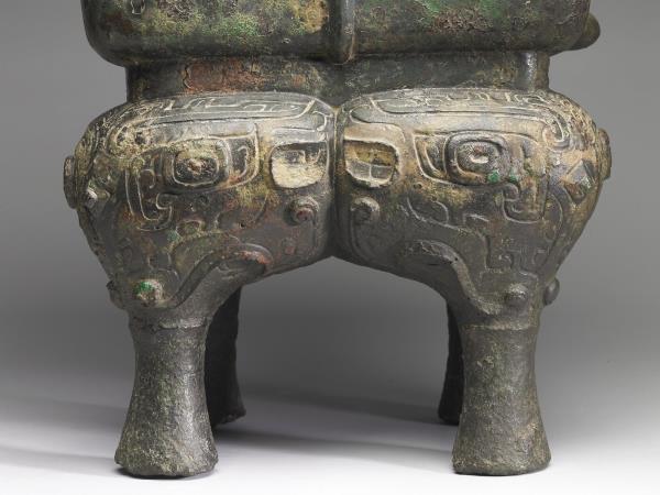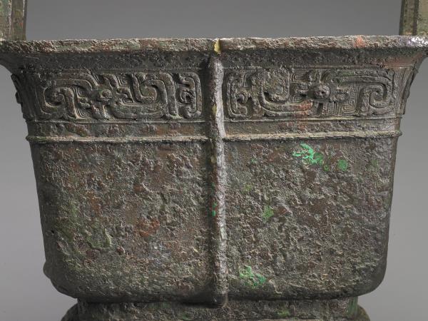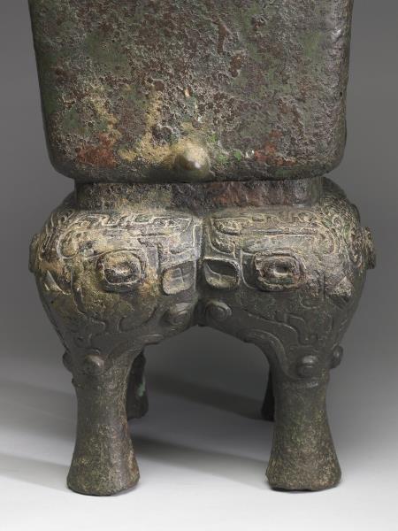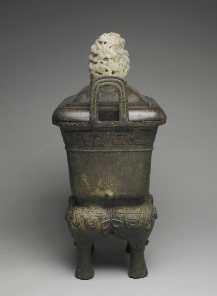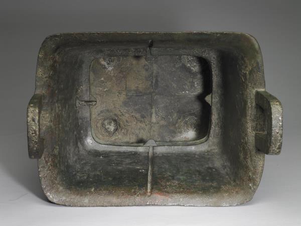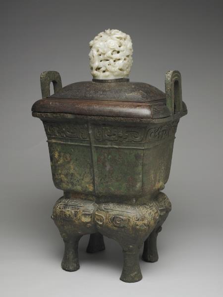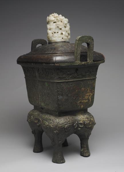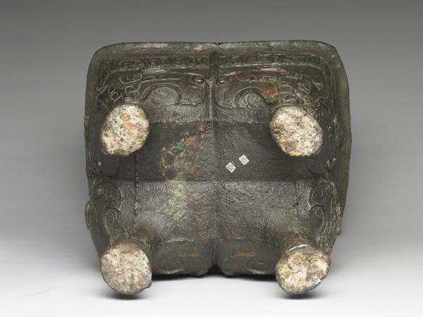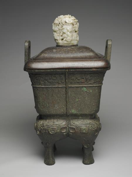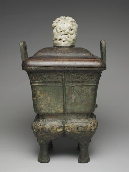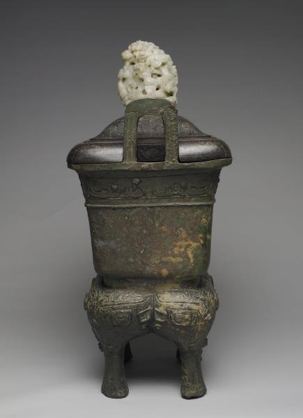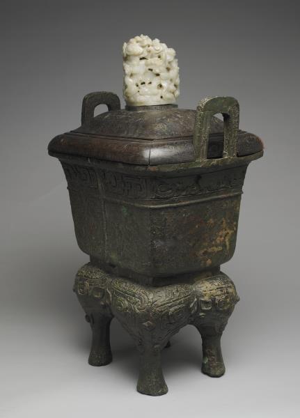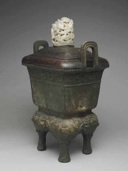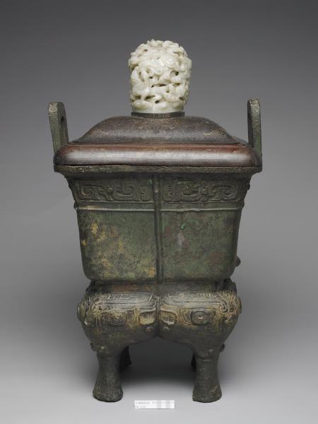 方體,立耳。口緣飾竊曲紋,地填雲雷紋,四足各飾獸面紋。隔板及箄均失。附木蓋玉頂。