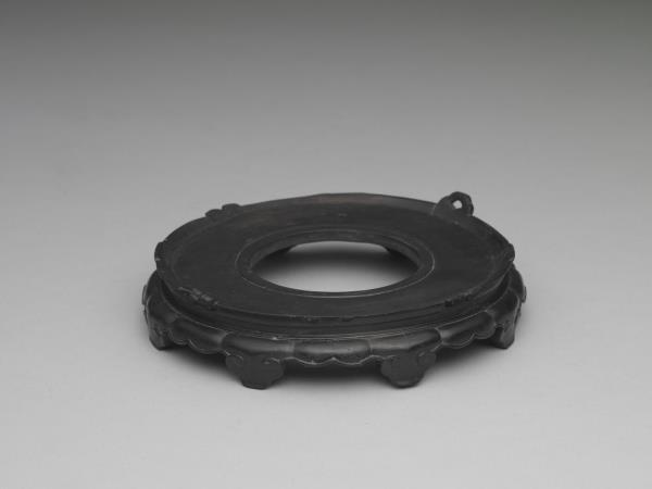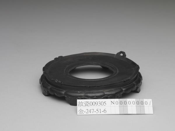圓形木座,座面為環形,兩側有環形凸起,以固定瓷洗;八如意雲形足,足間有花瓣形裝飾。座面背部有陰刻填金「古稀天子御玩」、「甲」及「宋定窑瑞獸洗」楷款。此件為故瓷9305附件。