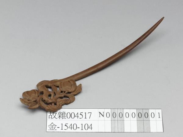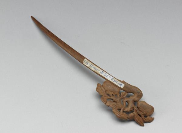 | 說明 | 髮簪,通體由肉桂木雕成,簪首單面鏤雕靈芝石榴及枝葉。寓有祥瑞及子孫繁盛之意。素挺呈優美弧形。 |