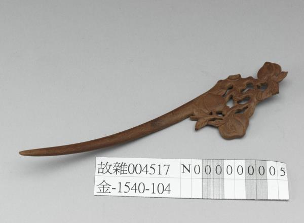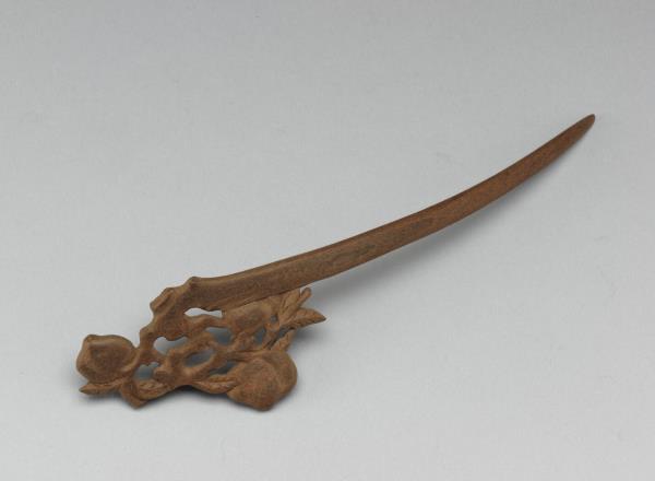 髮簪,通體由肉桂木雕成,簪首單面鏤雕三棵桃實及枝葉。素挺呈優美弧形。