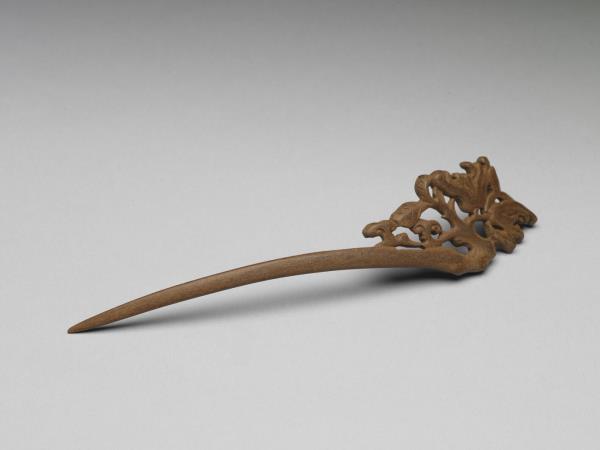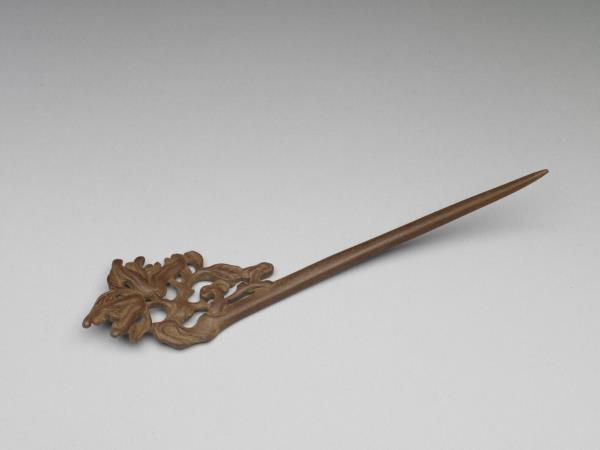 髮簪,通體由肉桂木雕成,簪首單面鏤雕雙佛手及枝葉,佛手與福壽諧音,此紋飾帶有吉祥寓意。素挺呈優美弧形。