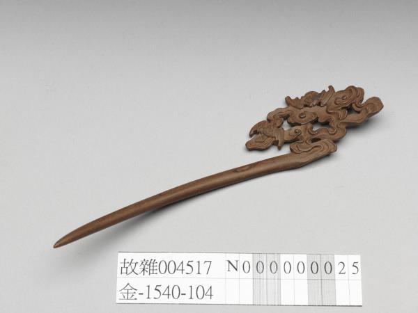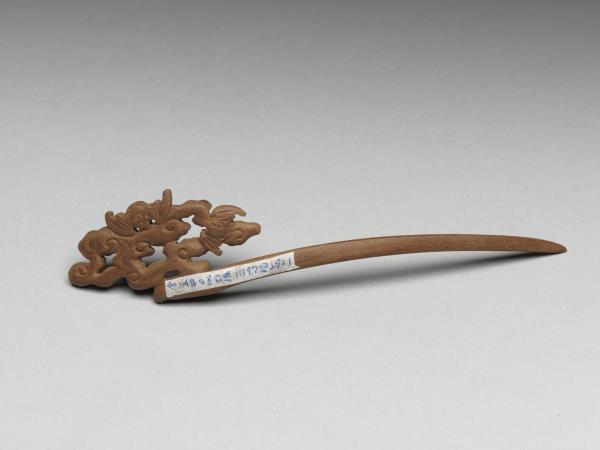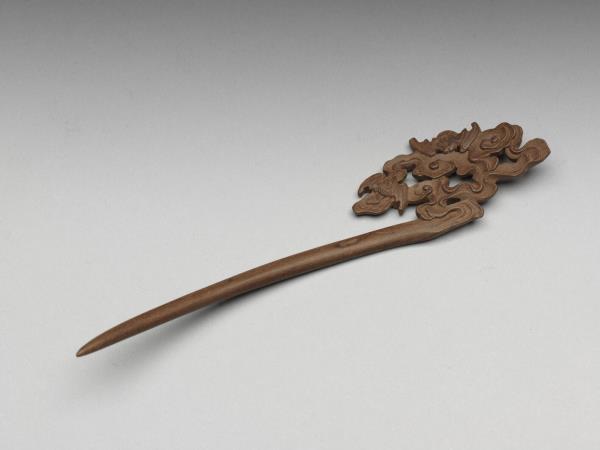髮簪,通體由肉桂木雕成,簪首單面鏤雕兩隻蝙蝠及雲紋。素挺呈優美弧形。