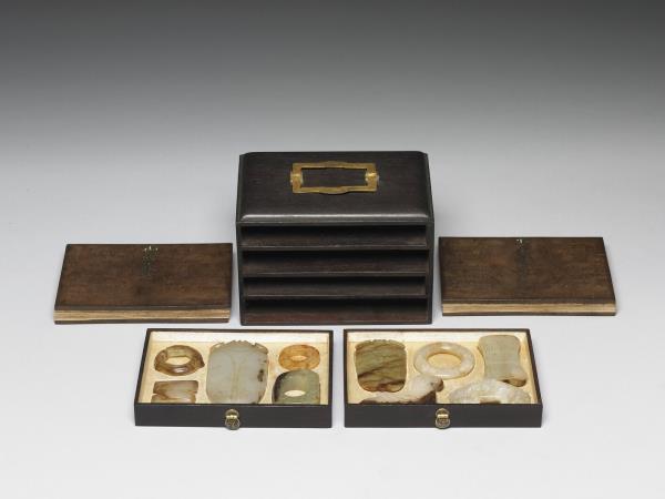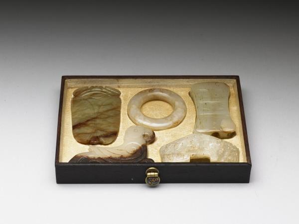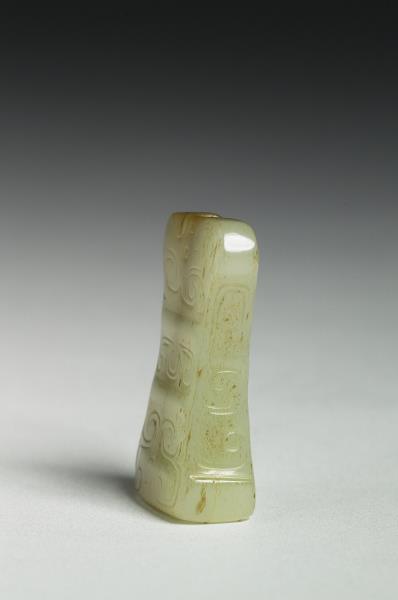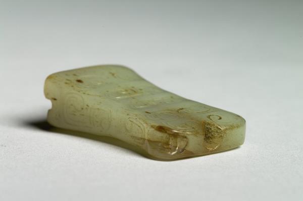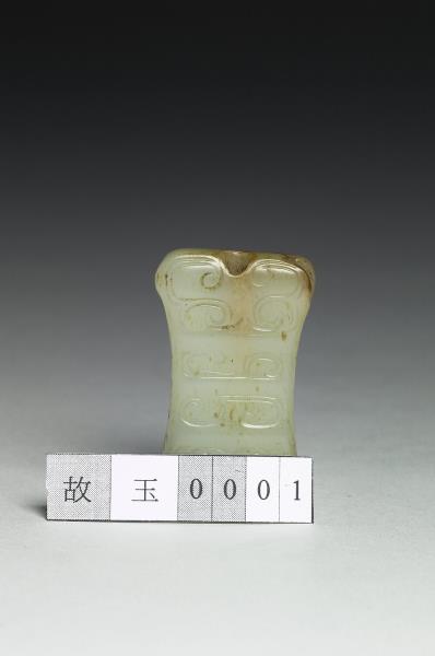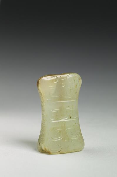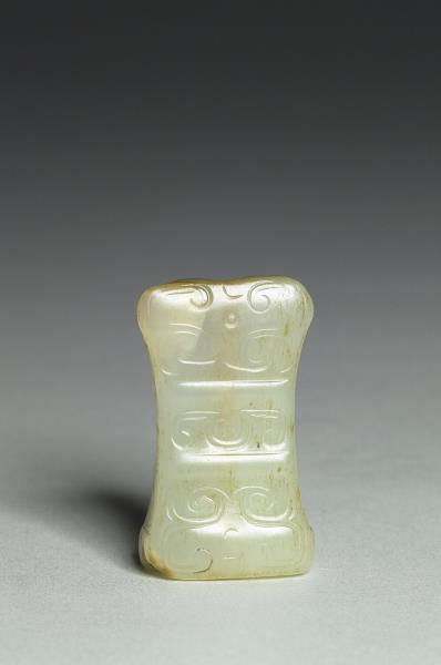 玉質,有黃灰斑。扁方形,上下不同寬,束腰有孔貫穿,器表飾側面龍首紋,並略有變形調整以配合形制,原於清宮時與數件文物,合儲物四層屜匣內。