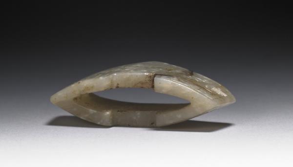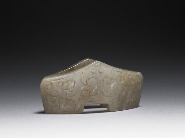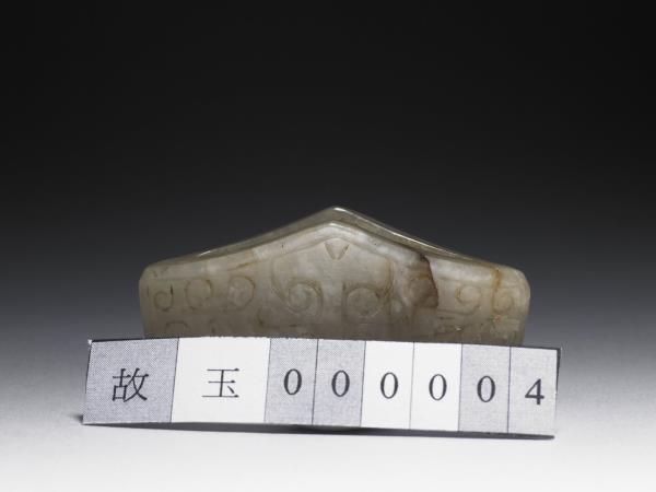 玉質,中空,器表為仿漢代的獸面紋。劍鐔是作為劍身與劍柄之間的間隔,本器為仿戰國晚期至西漢的作品。
