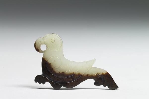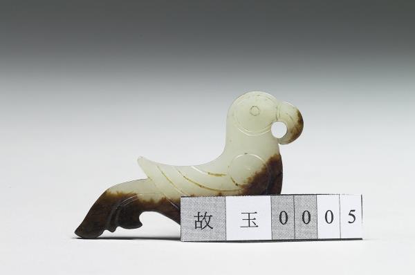 玉質,片狀,全器作側身鳥形,陰刻出鳥羽,尖喙、尾著地,喙下勾成圓孔,器下側泌呈深褐色。為仿西周早期的作品。