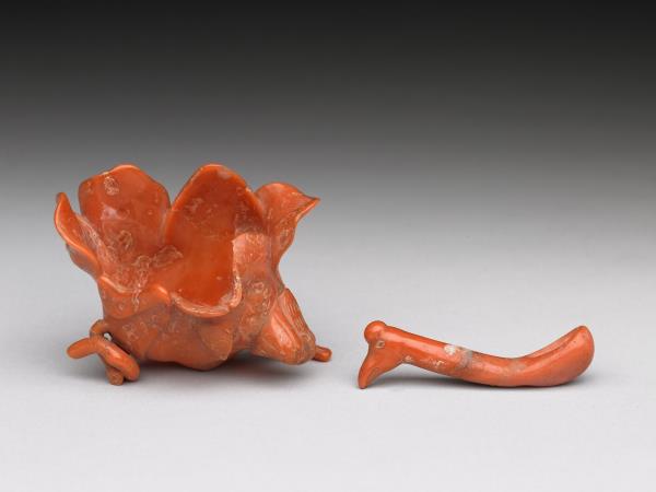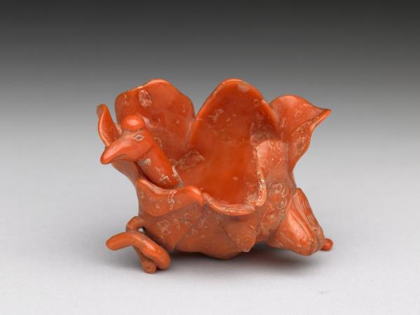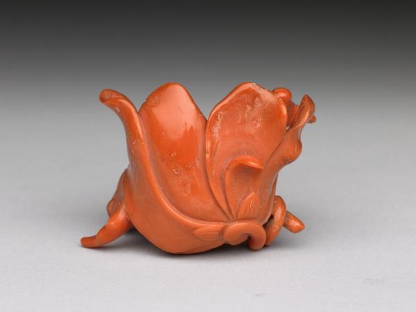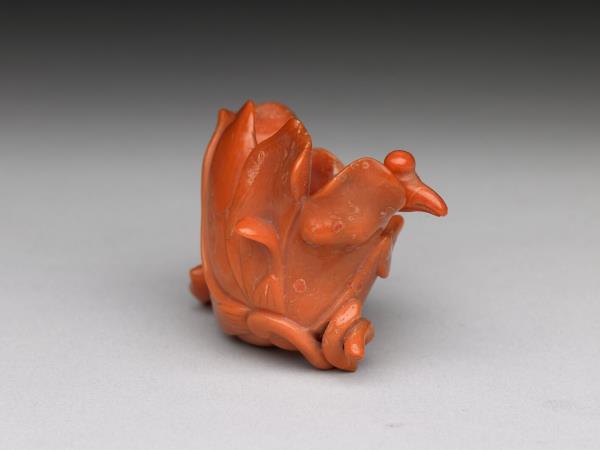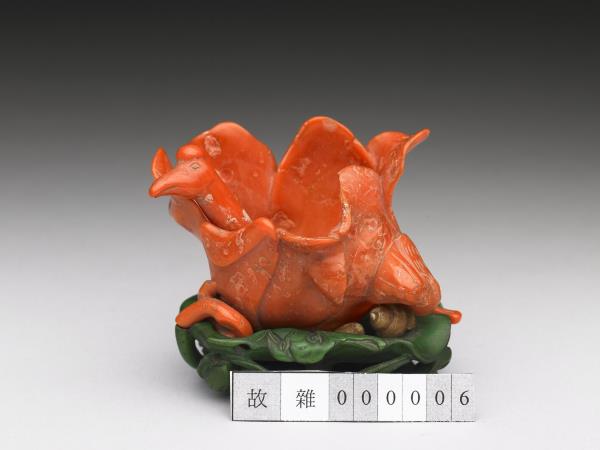 珊瑚,色紅,帶有白斑。全器雕為玉蘭花朵形,帶花蒂,附有鳥首形杓與染色骨座。座全器作一荷葉形,葉上有一螺一蚌。葉緣一端有蝙蝠,底部則鏤雕出葉莖與蓮篷。