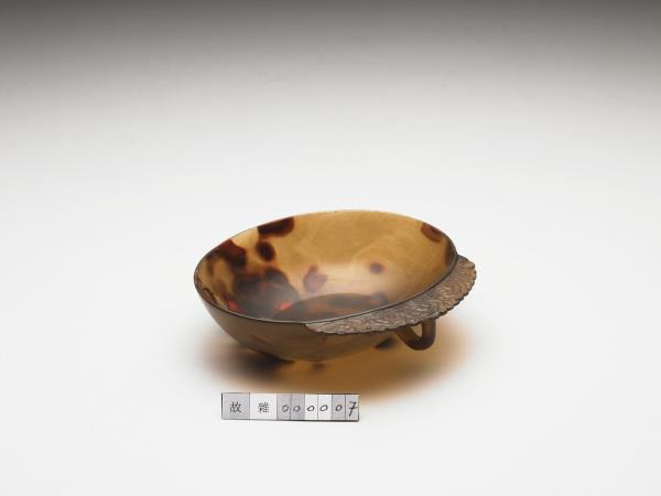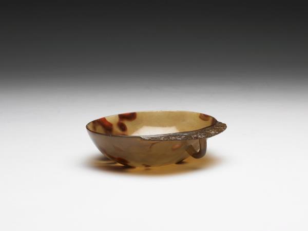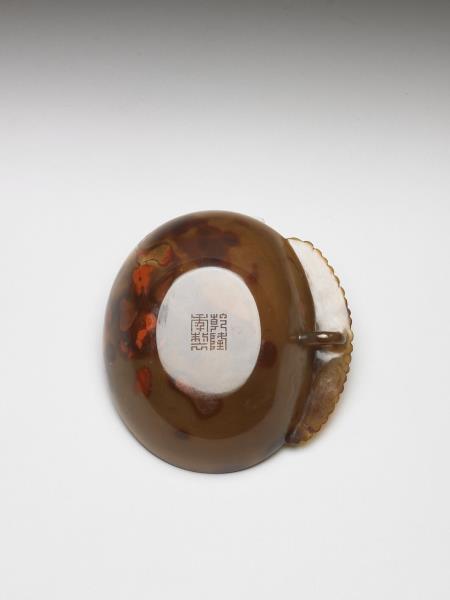 半透明褐色瑪瑙質,有大塊紅褐色斑點。侈口,碩腹,平底,帶新月形平柄,柄下有耳。器柄面雕如意雲紋,器身光素無雕飾。外底琢「乾隆年製」四字篆款。