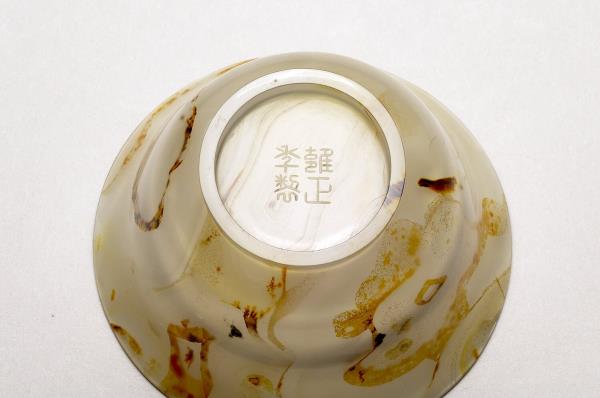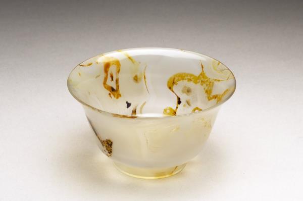 半透明灰白色瑪瑙質,有黃色與黑色斑紋。撇口,深腹,圈足外撇。器壁極薄,光素無紋。外底琢有「雍正年製」篆款。