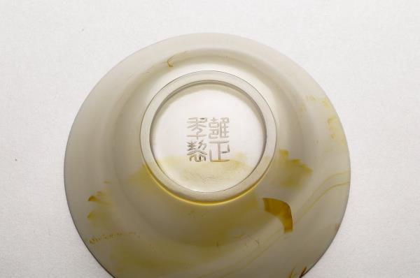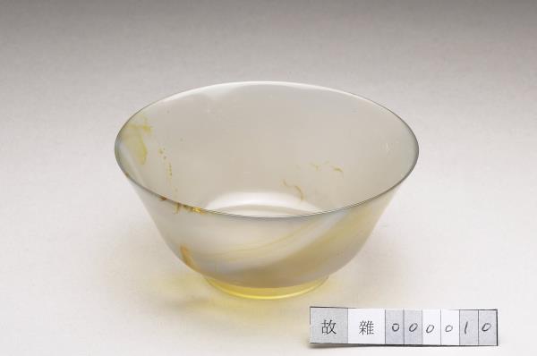 半透明灰白色瑪瑙質,有黃色斑點及帶狀紋理。微撇口,深腹,圈足。器壁極薄,光素無紋。外底琢有「雍正年製」篆款。