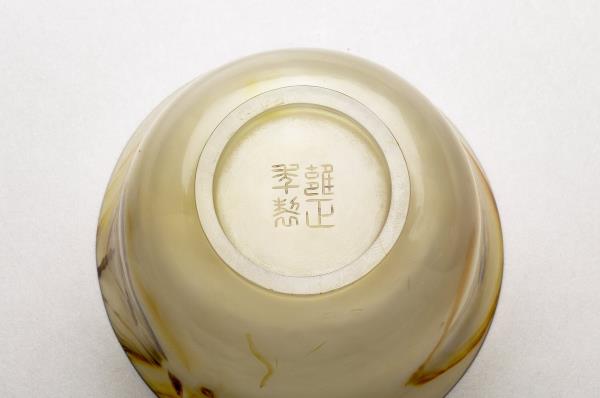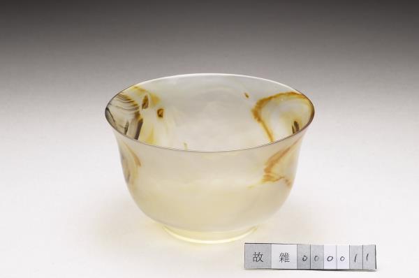 半透明灰白色瑪瑙質,有黃色及黑色帶狀紋理。微撇口,深腹,圈足。器壁極薄,光素無紋。外底琢有「雍正年製」篆款。