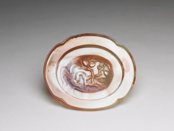 半透明灰白色瑪瑙質,有橙、紅色帶狀紋理與鮮紅色斑點。器作橢圓四瓣海棠花造型,托淺壁。托盤面高浮雕桃樹,樹上有枝、葉與桃實。