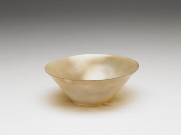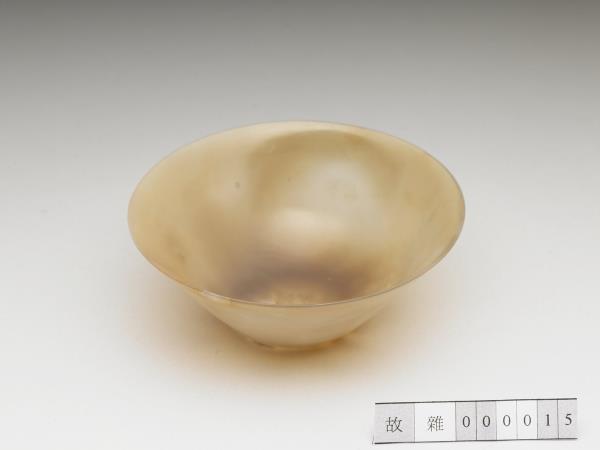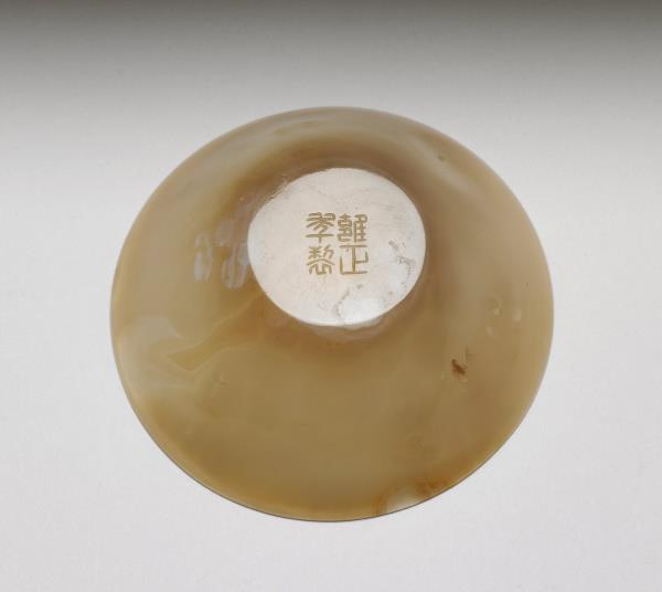灰褐色不透明瑪瑙質,器底為黃褐色。侈口,深腹,口以下腹漸收,平底。全器光素無紋,外底琢「雍正年製」篆款。