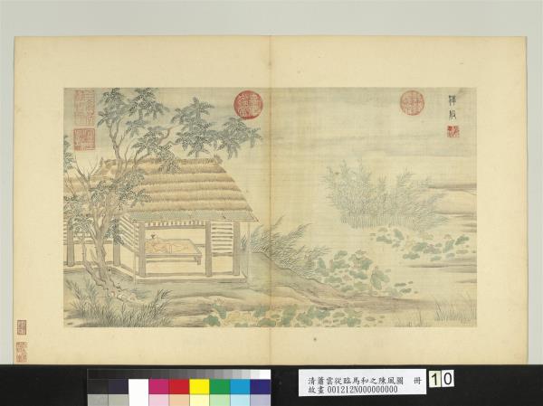 樹下一茆屋,屋中一榻,榻上人倚枕托腮而臥。屋外水塘,荷花正開,清風微揚,蘆草荷蓋隨之擺動。通幅用筆如螞蝗蠕動,蓋學宋人馬和之。