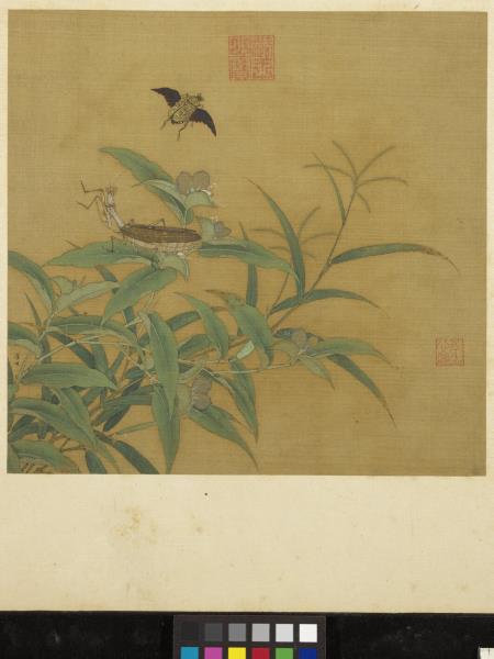 畫面左下方枝葉空隙處有「李迪」款。據《南宋院畫錄》記載,李迪(十二世紀)是河南孟縣人,曾任職於徽宗朝的畫院;靖康之變時亦南遷,在高宗(1127-1162)、孝宗(1163-1189)、光宗(1190-1194)朝服務,為南宋早期宮廷花鳥竹石的代表畫家之一。此作最精彩的部分應屬色彩的表現,讓人幾乎忘了昆蟲追逐與逃脫、生死瞬間的緊張,而陶醉在花葉與昆蟲散出的撩人感官魅力。(20101015)