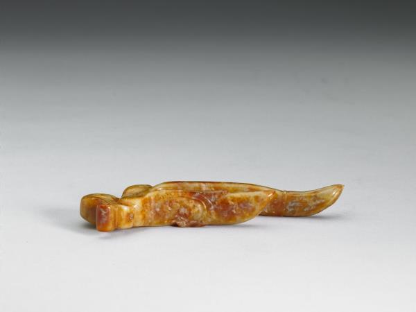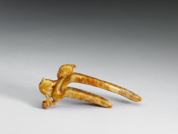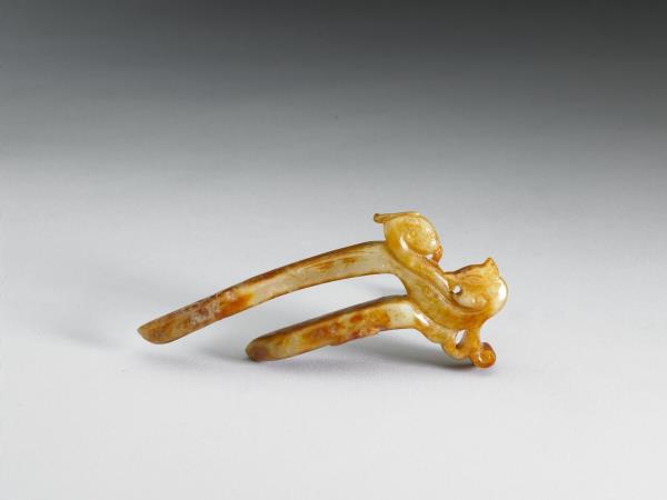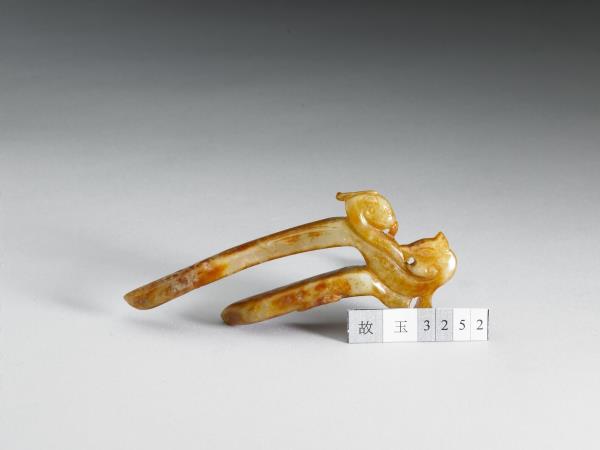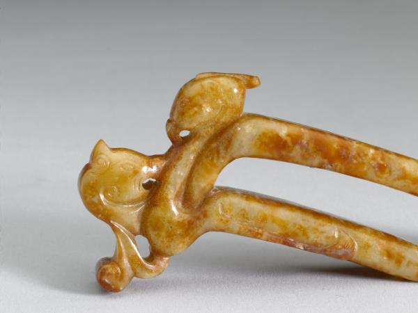 玉質,泛濃淡不一的黃赭斑,玉質淳古。一龍一鳳,身捲繞而面相對,兩身軀剛好作髮笄的針,插入頭髮。雕工略粗。