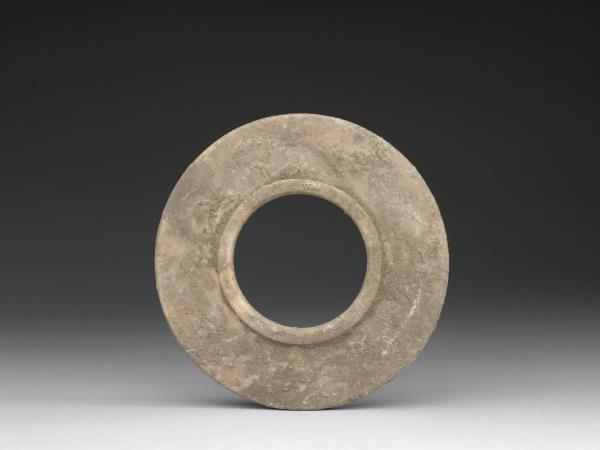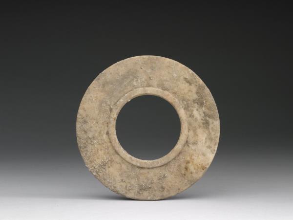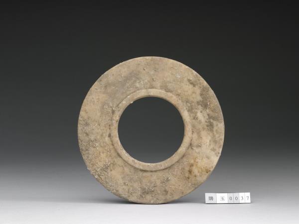 灰白色石英,有赭色及淡墨色斑紋,表面有許多附著物。中孔略大,兩面沿著孔緣各作一圈突邊。