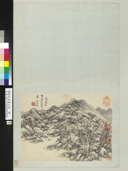 A water pavilion sits in solitude, hidden among trees in a dense forest, surrounded by undulating mountain peaks. This painting was executed with light ink wash and wet brush shading. Heavy ink and dry brushwork were further employed for greater emphasis. Leisurely, relaxed, clear, and distant, this work achieves an effect beyond mere rules of brush and ink. This painting is from the album, Five Landscape Painters of the Ch’ing Dynasty.