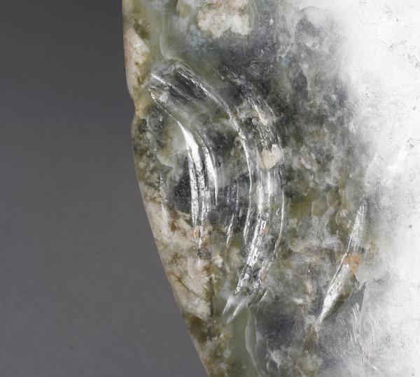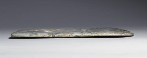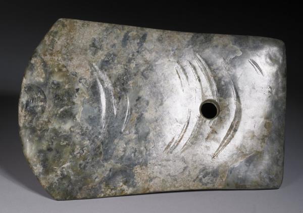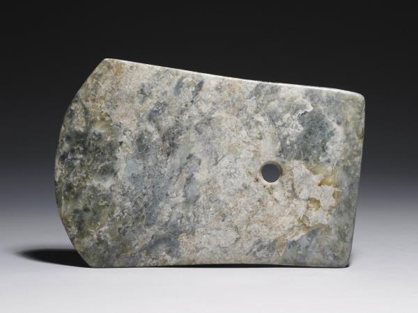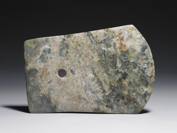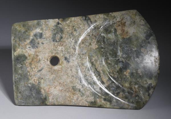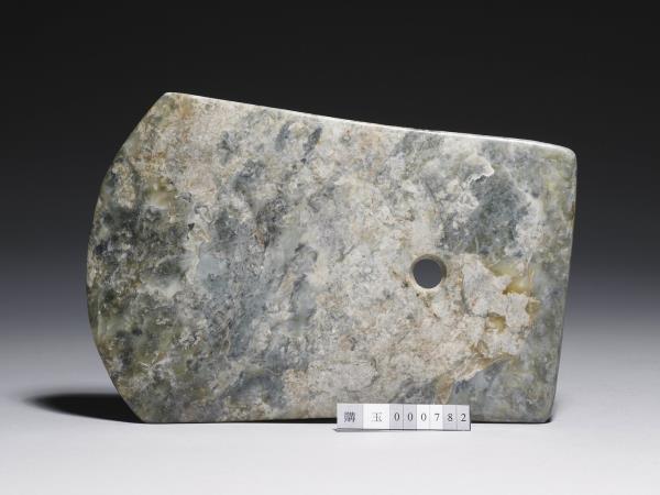 | 說明 | 質為斑雜的閃玉,局部淺褐斑。全器厚薄十分不勻,刃部無使用痕。兩面器表都留有明顯的線切割造成的弧窪痕。中孔由兩面對鑽,因工具磨耗快而造成孔壁斜度大,在孔壁中央留下接合痕。全器器形與張陵山出土良渚早期玉鉞相似,器表粗放的線切割顯示做工的古樸。 |