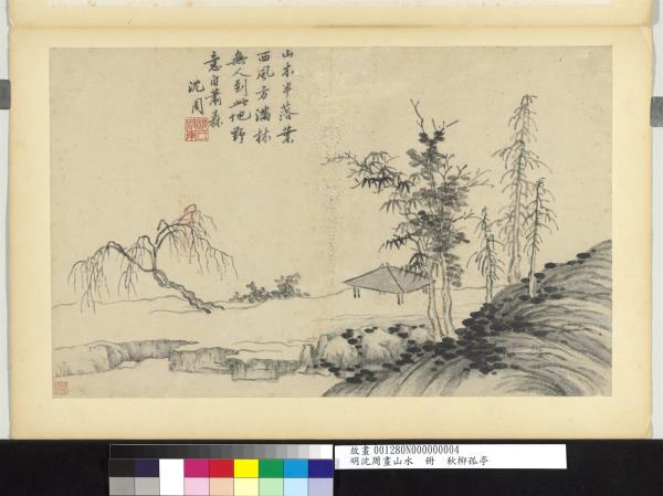 | 參考書目 | 何炎泉、陳階晉、陳韻如,〈明沈周畫山水 冊 秋柳孤亭〉,收入《明四大家特展-沈周》(臺北:國立故宮博物院,2014.01),頁172-175、324。 |