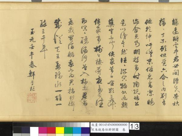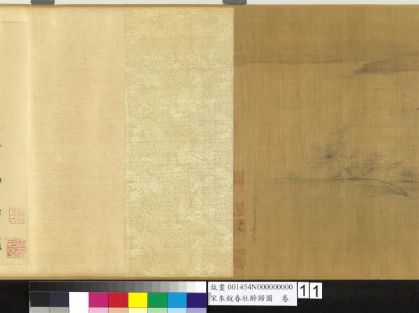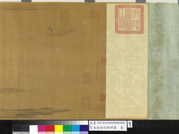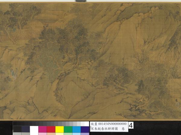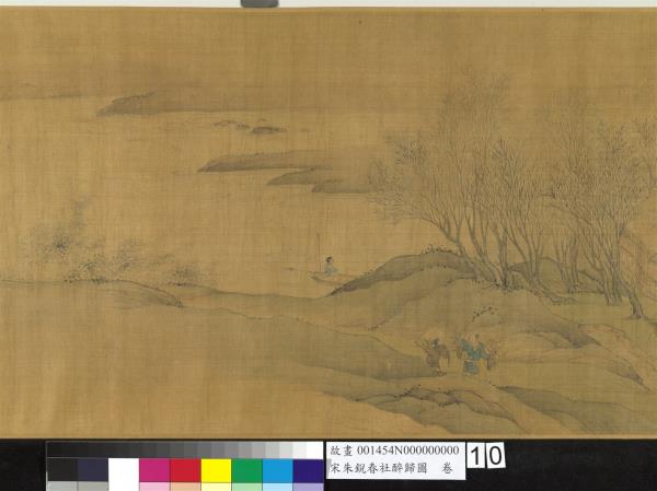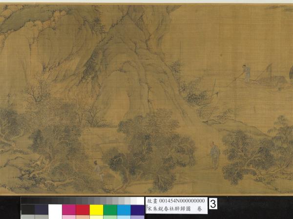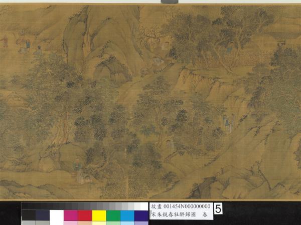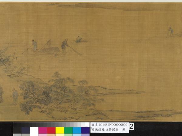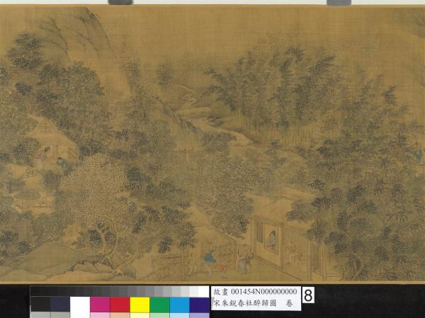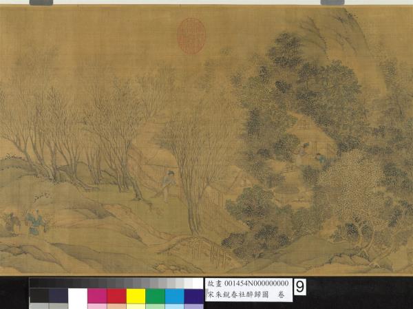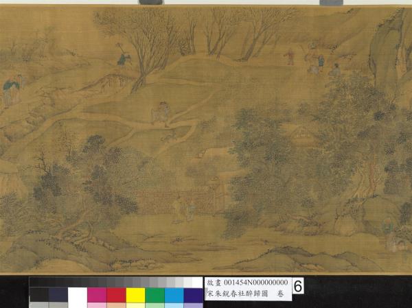 朱銳(活動於十二世紀),河北人。北宋宣和初授畫院待詔。南宋紹興年間復職,授迪功郎,賜金帶。工畫人物山水,師法王為,尤好寫騾綱、雪獵、盤車等圖。古制,每歲立春後第五個戊日為春社,是日舉行土地祭祀,以祈豐收。本卷繪祭祀畢,宴飲後的橫斜醉態,饒富奇逸之趣。沿途萬木復甦,大地欣榮,正是唐人王駕社日詩「桑柘影斜春社散,家家扶得醉人歸。」的寫照。幅末紹定二年之款,疑為後人添加,而其風格筆墨亦近於明代。