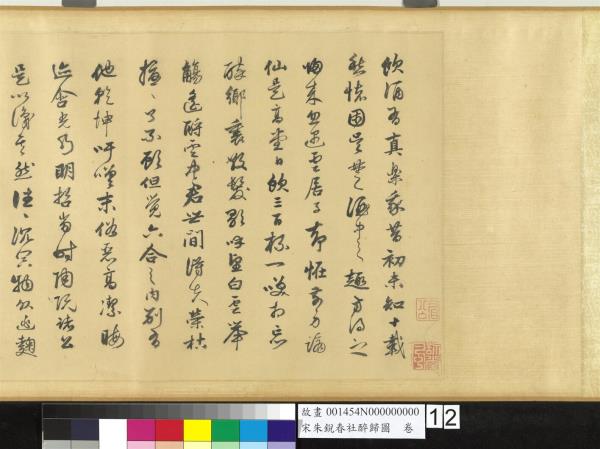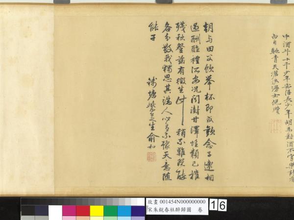 Chu Jui was a native of Hopeh who served in the Painting Academy of the early Hsuan-ho era (1119-1125) in the Northern Sung as a painter-in-Attendance. Following the court to the south, he resumed his position in the Shao-hsing era (1131-1162) and was awarded the title of Gentleman for Meritorious Achievement as well as the Golden Belt. He painted figures and landscapes, following the style of Wang Wei (699-759 or701-761), and he was especially gifted at representing pack animals, hunting scenes in snow, and wagon trans. According to tradition, the Spring Sacrifice occurs at the end of the second lunar month, when prayers are made to the local gods for an abundant harvest. This handscroll depicts the moment when drunken revelers leave the feast after the sacrifice. Guests are steadied and helped home by their servants as they sway in an inebriated manner. Shrubs along the way seem rejuvenated as does the earth itself. This appears to be a pictorial rendition of "The Spring Sacrifice" by the T'ang (618-907) poet Wang Chia. It reads, "Mulberry trees cast long shadows at the end of the Spring Sacrifice; everybody is steadied as drunken revelers return home." An inscription dated to 1132 at the end of the scroll appears to be a later addition, and the style, moreover, is closer to that of the Ming Dynasty (1368-1644).