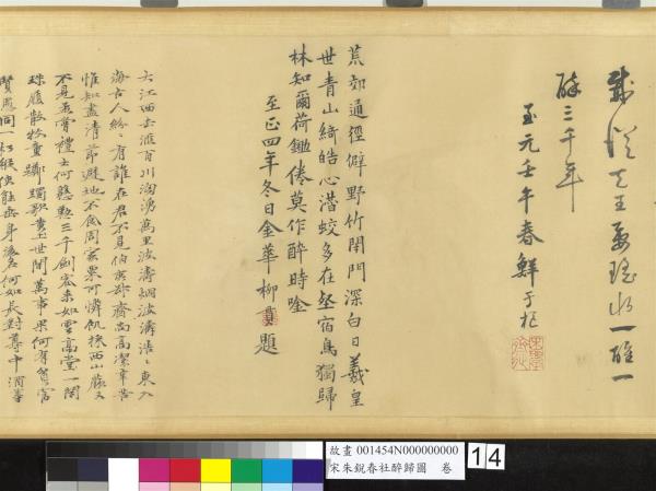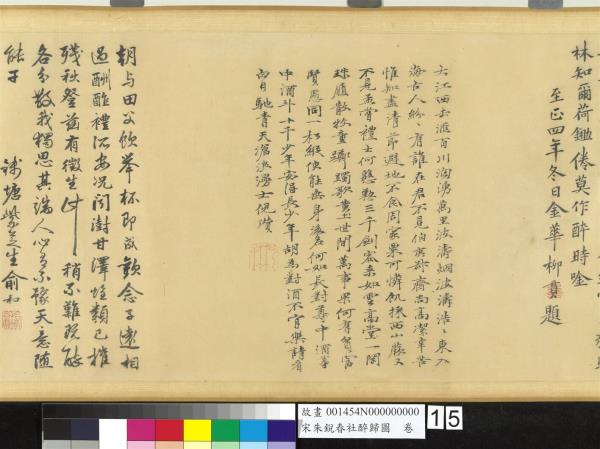 荒郊通徑僻。野竹閉門深。白日羲皇世。青山綺皓心。潛蛟多在壑。宿鳥獨歸林。知爾荷鋤倦。莫作醉時唫。至正四年冬日金華柳貫題。 |