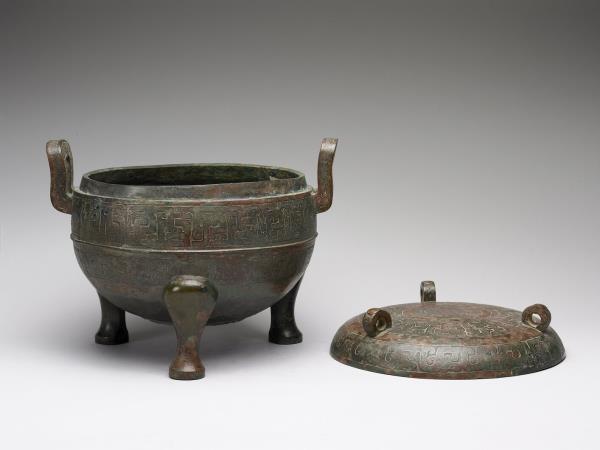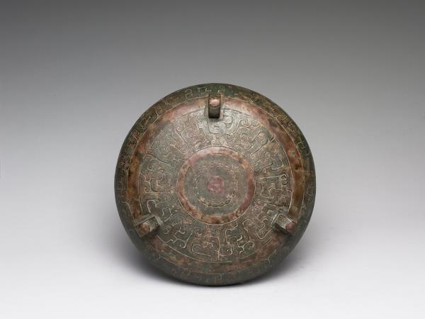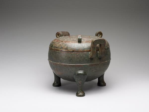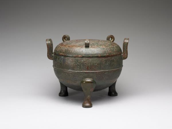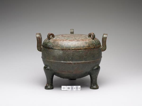 圓鼎,附耳微曲,圓腹,三蹄形足,帶子母口圓頂蓋,蓋上分飾三立環。器腹中央帶一道凸弦紋,上下方各飾蟠螭紋。蓋頂中央飾兩圈圓渦紋,環身飾幾何紋。