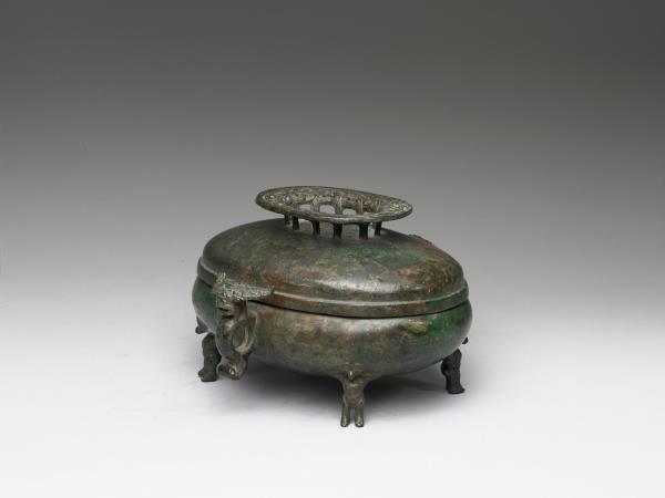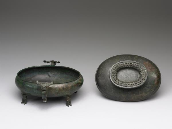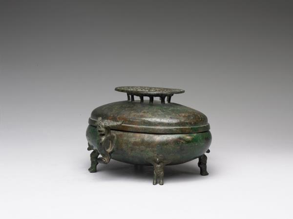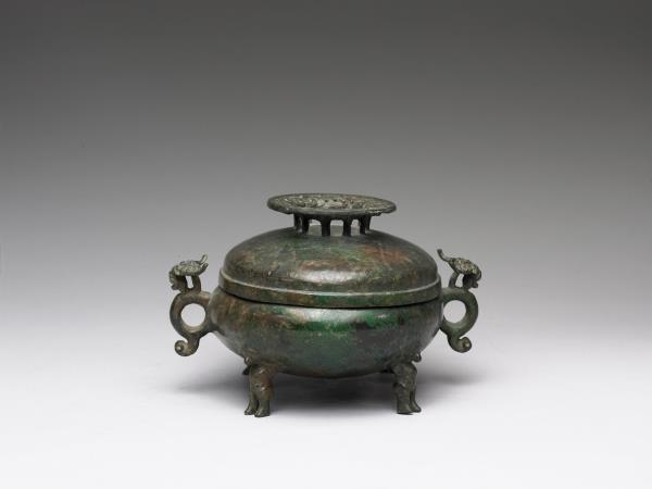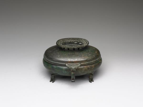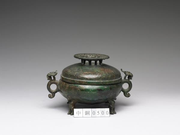| 說明 | 橢圓形盦,直口,雙螭耳,圓鼓腹,圓底,四人形足,帶鏤空圈足鈕穹頂蓋。全器外壁光素無紋,四足各為一抽象人形,雙手向後作抬舉狀而撐起器身。蓋鈕飾相互勾連之幾何紋。著錄於《西清續鑑‧乙編》卷十七頁三,作「周螭耳盦」。 |