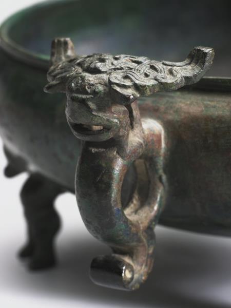 He wine vessel with chi-dragon handles and feet in winged human figures |