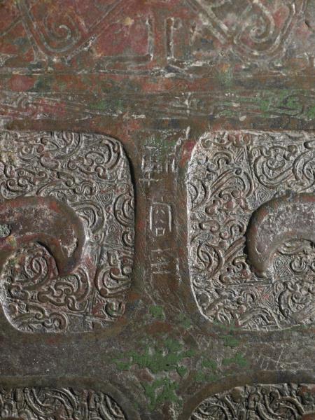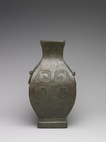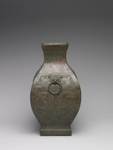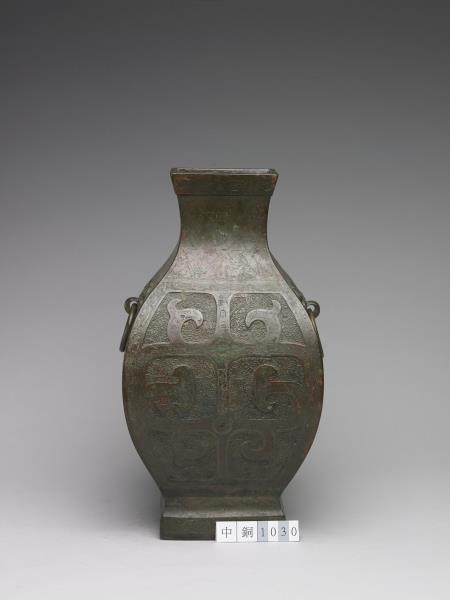 | 說明 | 鈁,四面等邊的方壺,微侈口,直頸,溜肩,圓腹,方形圈足,兩側有獸首啣環耳。口沿飾卷雲紋,頸部飾三角獸面紋及勾雲紋,肩腹部有對夔鳳紋將畫面劃成六等分,地襯飾夔龍紋,圈足飾勾雲紋,有一面肩部中央有銘文「□容三」。 |
