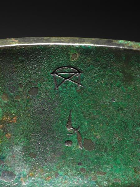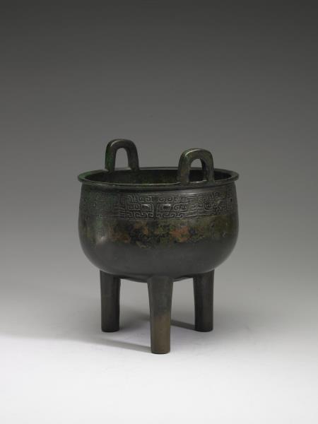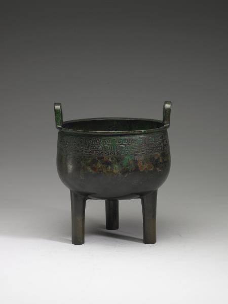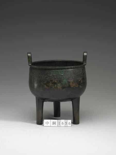 圓鼎,立耳,柱足。口沿下飾有一道獸面紋,內壁有銘文「冉父丁」三字。