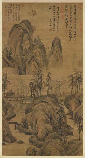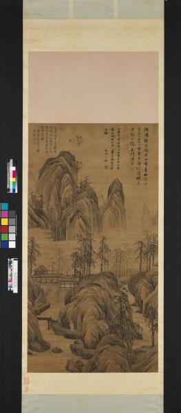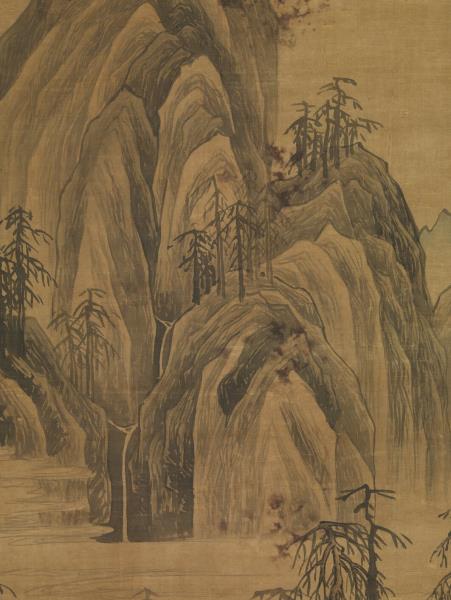 本幅畫煙霄拔嶂,懸泉直瀉而下,層台水榭,一高士策杖山徑閒步,遠山山腳雲氣迷漫,山石以斧劈斫趯,勁利瀟洒。
