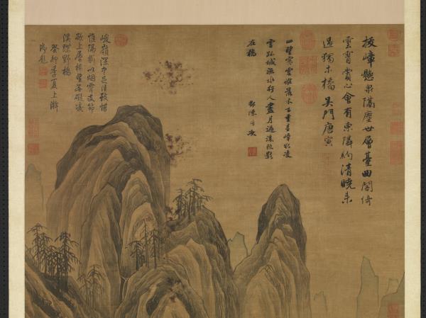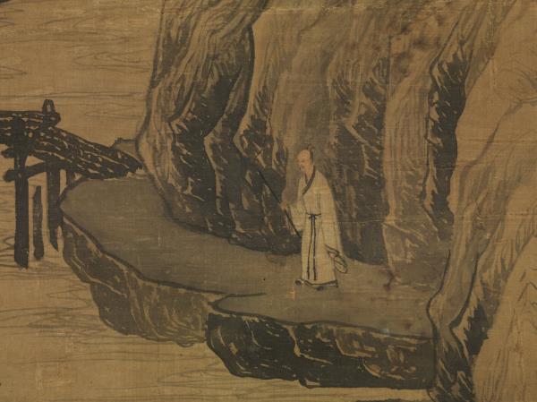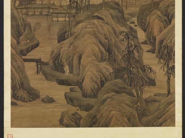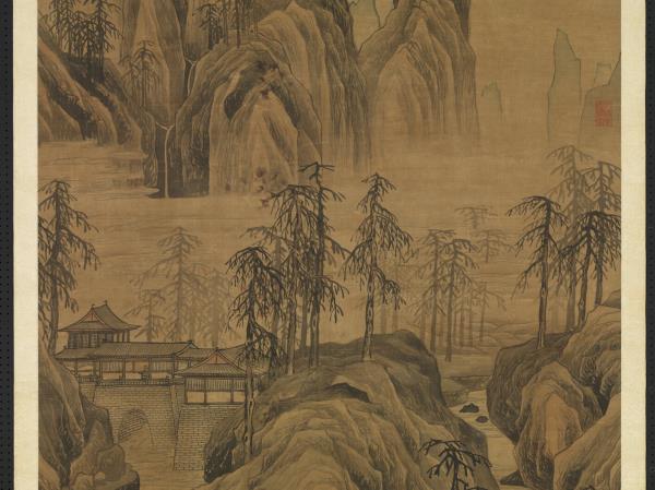In this painting, T’ang Yin has rendered peaks in the background rising above mist and punctuated by a cascading waterfall. Multi-storied buildings appear over the water. A lofty scholar walks leisurely with his staff along a winding path in the foreground. Thick mist shrouds the foot of the distant mountains, while the earthen forms have been rendered with forceful and succinct axe-cut strokes that clearly define the features.