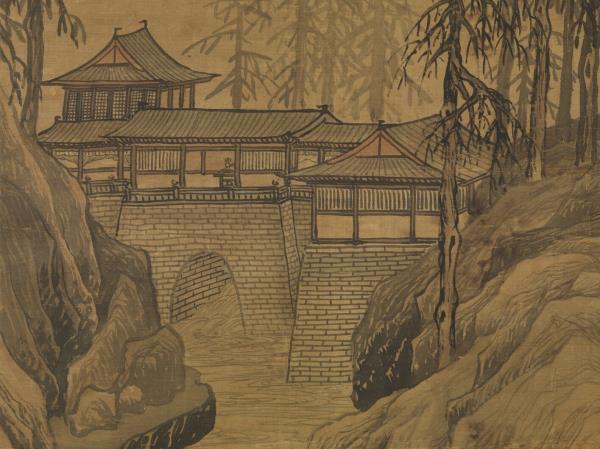 拔嶂懸泉隔塵世。層臺曲閣倚雲霄。賞心會有東鄰約。清曉來過獨木橋。吳門唐寅。 |
